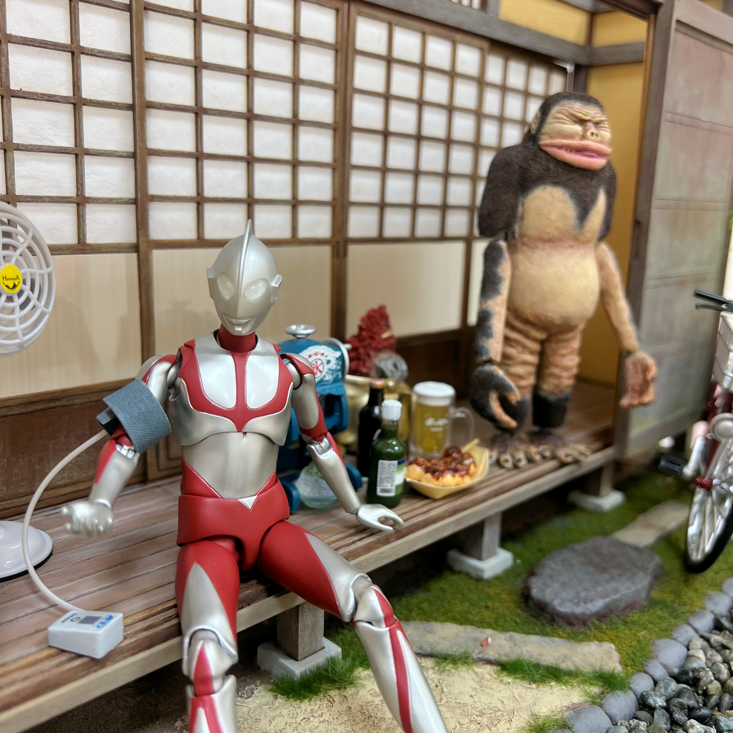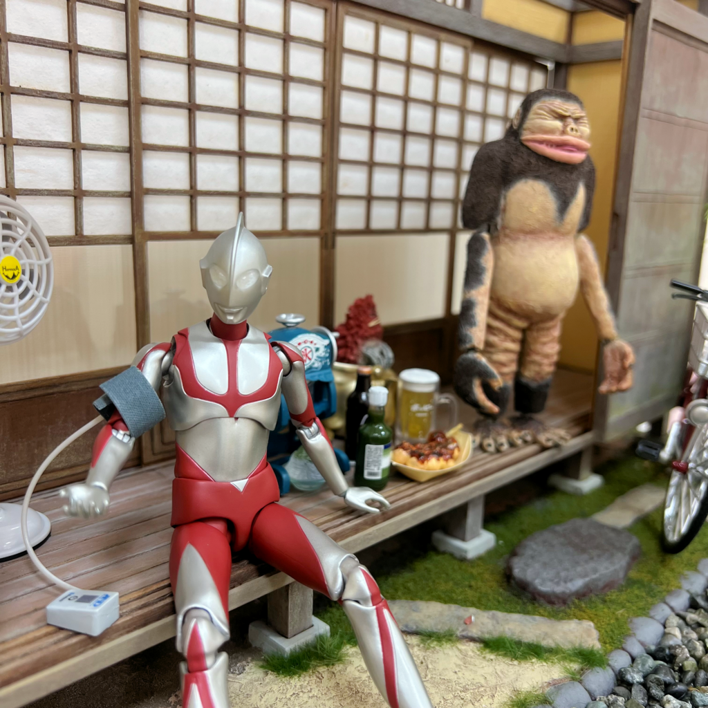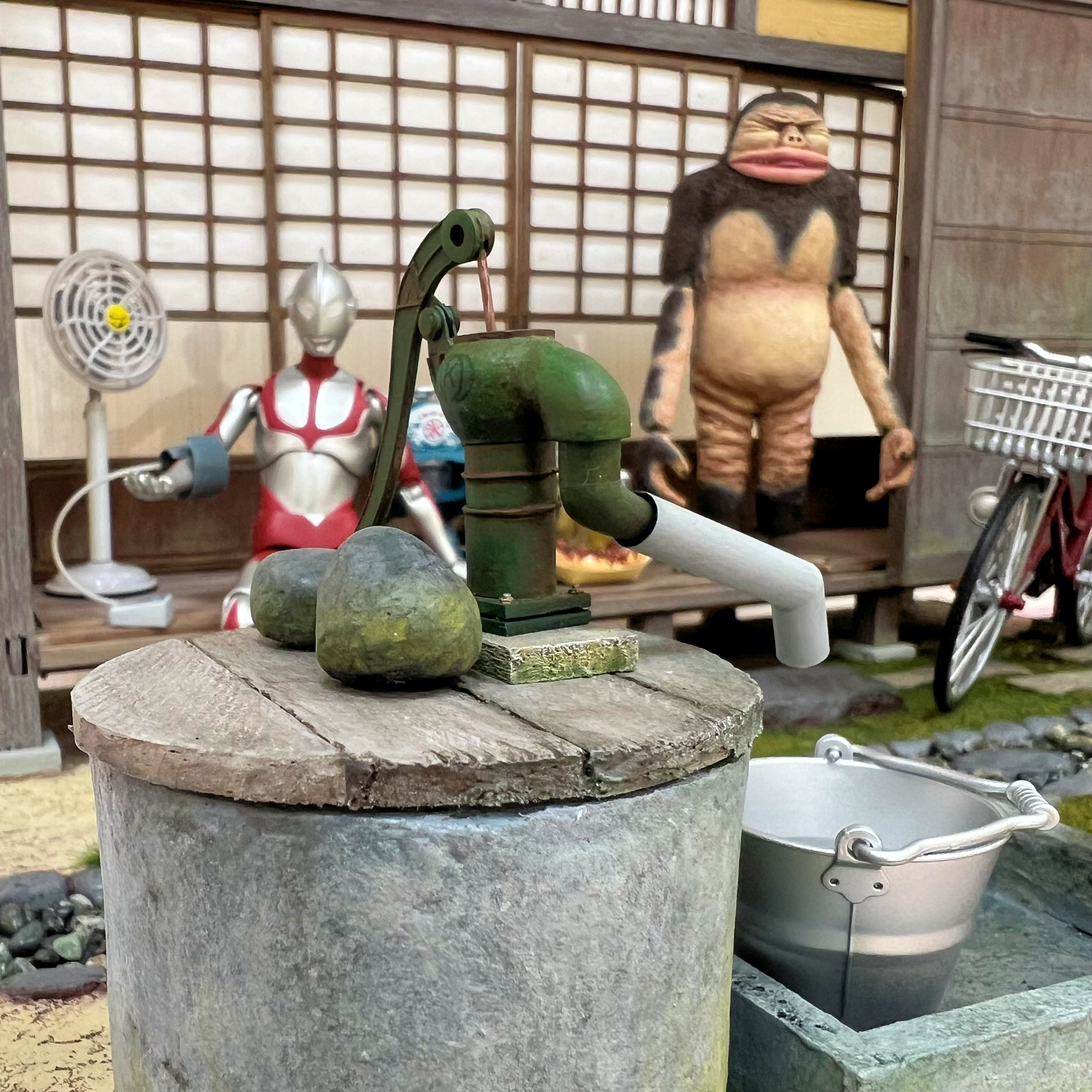 自作ジオラマ1/12「井戸のある縁側・血圧を計測するウルトラマン」 製作塗装:院長